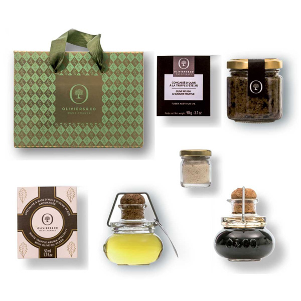 Sie enthält alles, was Sie zum Verfeinern eines Aperitif oder eines Gerichts benötigen: ein Concassé mit Trüffel, unsere Spécialité mit Olivenöl sowie unser Salz, dazu ein köstlicher Balsamico mit Feigen.